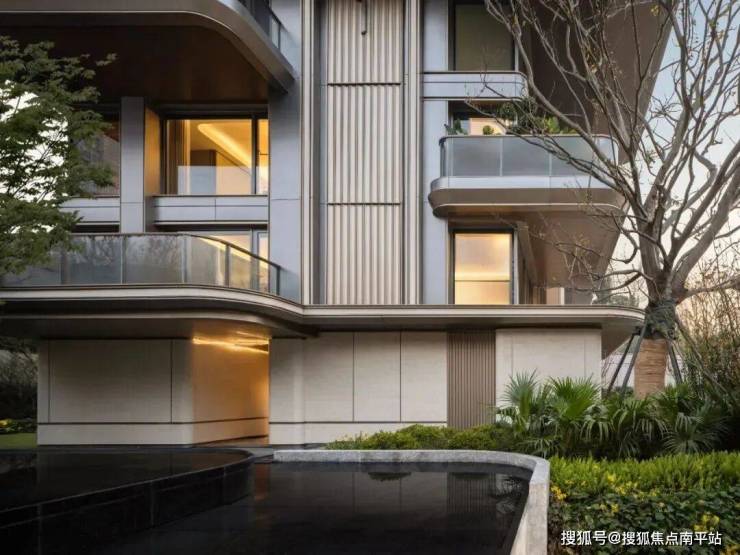 置身园中,极具质感的立面映入眼帘,作为南京首个第四代住宅公建化外立面,项目采用弧形石材+精奢全铝板+大面积玻璃幕墙,立体感和层次感都非常突出。