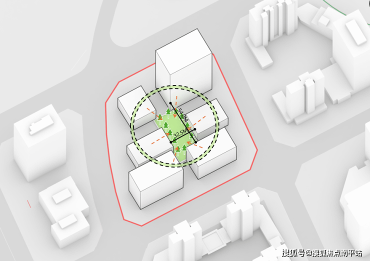 项目占地约29.65亩,规划层面以南北向空间叙事轴线为核心,构建层级分明的规划肌理,六座独立办公建筑沿轴线依次排布。遵循“地标强化 + 界面呼应”的设计逻辑,将较高塔楼布局于西南侧,既强化主路城市界面的昭示性,又以挺拔形态塑造区域标志性天际线;酒店与企业办公业态规划于北侧沿街界面,实现商业价值与城市服务功能的有机衔接;较低矮的独栋办公建筑则围合分布于基地中部,以核心广场为景观枢纽形成聚合式布局,最大化利用中心公共空间,提升园区空间均好性。