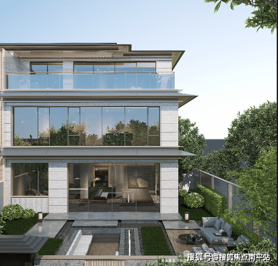 别墅区建筑不仅选用大面积干挂石材与玻璃铝板结合的立面,还设计了“重檐”元素的东方气质,“线框造型” 强化别墅横向线条的大气磅礴之势。