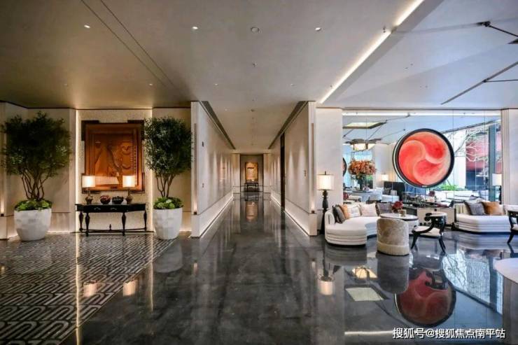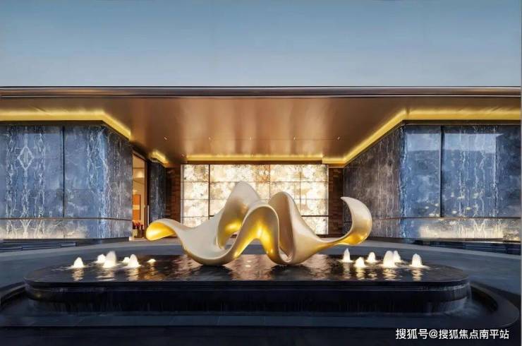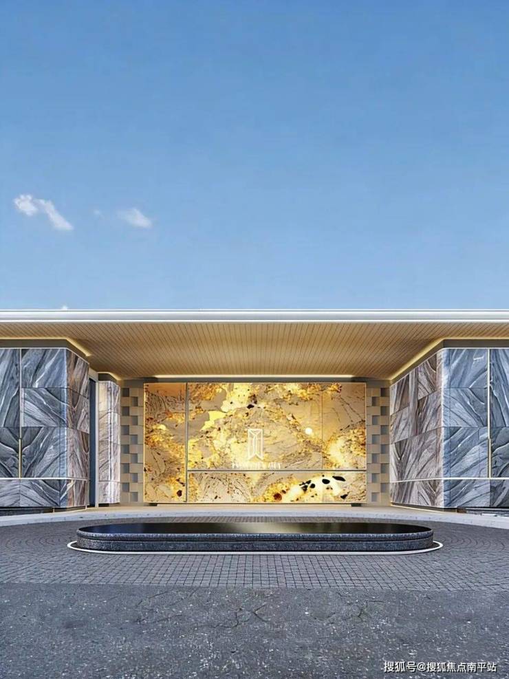 主入口门庭,超百米宽、7米高,以恢弘气势开启归家之旅,营造第一重归家仪式感。其设计灵感源自闽南官式大厝的中轴对称美学,精选潘多拉透光奢石、土耳其月光米黄石材、巴西梦幻蓝宝奢石等珍稀石材铺陈。入口处的“帆舞云海”艺术雕塑,以灵动抽象的线条勾勒帆影,将航海精神与当代审美巧妙融合,成为视觉焦点。