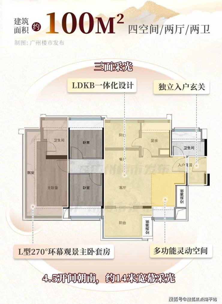 就拿最小的 建面约100平户型 为例,也做到了 四个开间朝南 ,采光面超过14米。阳光从早晒到晚,家里每个角落都亮堂堂。
