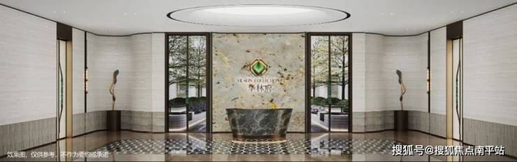 道路尽头的景墙上是奢石界天花板-维多利亚绿奢石,有四海升平、出入平安的美好寓意,金镶玉Logo也镶嵌其上,每一处细节都在不断强调项目的专属感。