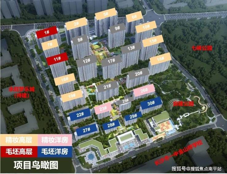 项目位于长沙市一中金山桥学校对面,总建面约38.4万方,约2.2超低容积率,40%绿化率,由18栋高层、8栋洋房组成,整体布局沿袭南北中轴对称特点,强调序列感和节奏感,建筑围绕中心景观布局,保证家家户户优良观景视野。