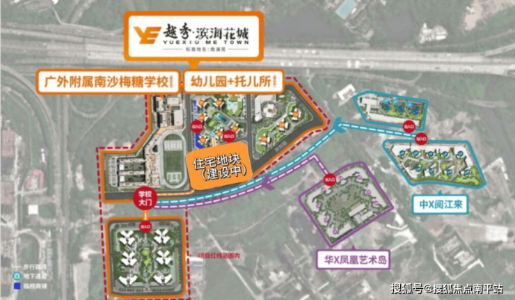越秀・滨海花城位于广州市南沙区明珠湾板块(亭角)工业路梅山生活区南侧约 200 米(越秀梅糖项目),由广州城建开发南沙房地产有限公司(越秀地产旗下)开发,越秀物业提供物业服务(物业费约 2.8 元 /㎡/ 月)。