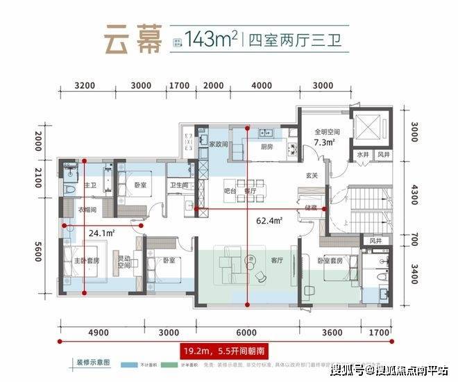 19.2米!做出了南向近5开间,这个数据放在180平米户型都是均值以上了。同时超大开间带来了多达14个采光面,较大提升了居住的舒适度和健康度。