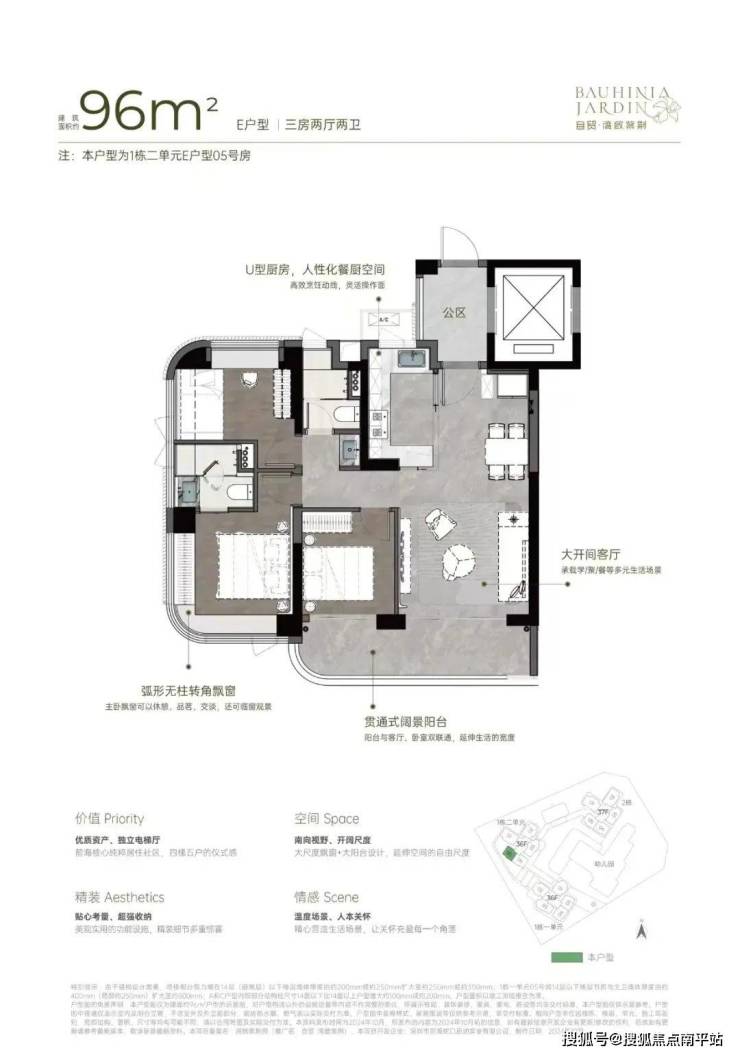 从空间布局来看,U 型厨房的设计极为人性化,大开间客厅与宽阳台是整个户型的最大亮点,西南向视野使得整个户型采光充足,贯通式阔景阳台与客厅、卧室双通,极大地拓展了生活空间的宽度。主卧的飘窗台也是一大亮点,弧形无柱转角飘窗不仅提供了广阔的视野,还增加了室内的采光。