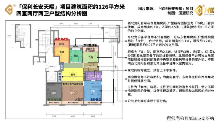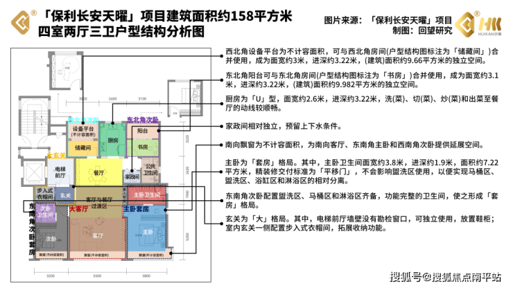 这个户型的西南角次卧、南向客厅和东南角主卧面宽,分别占面宽总量的28%、38%和32%。这个项目的「均衡」,就体现在了这里。