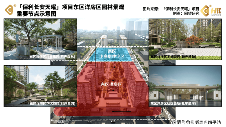 这个项目还设置了五处首层架空,分别担当「儿童亲子(儿童活动)」(位于西区10号楼、东区3号楼)、「青年娱乐」(位于西区8号楼、东区2号楼)和「四点半课堂」(位于东区4号楼)等功能。架空层和会所算是配齐了社区的公共服务功能,并完全覆盖了老(老年人)、中(中年人)、青(青年人)、少(少年儿童)四代人。可这个项目公区的最大亮点,反而不在「功能」,而在「形」、「意」。这一点,小回放在后文再解读。