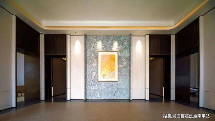 再来看归家大堂,对景墙面选用了来自克罗地亚顶级矿脉的贝金米黄奢石,以及拥有“全球最贵”称号的瑞士翡翠绿奢石,色泽沉稳,低调中透射高奢质感。