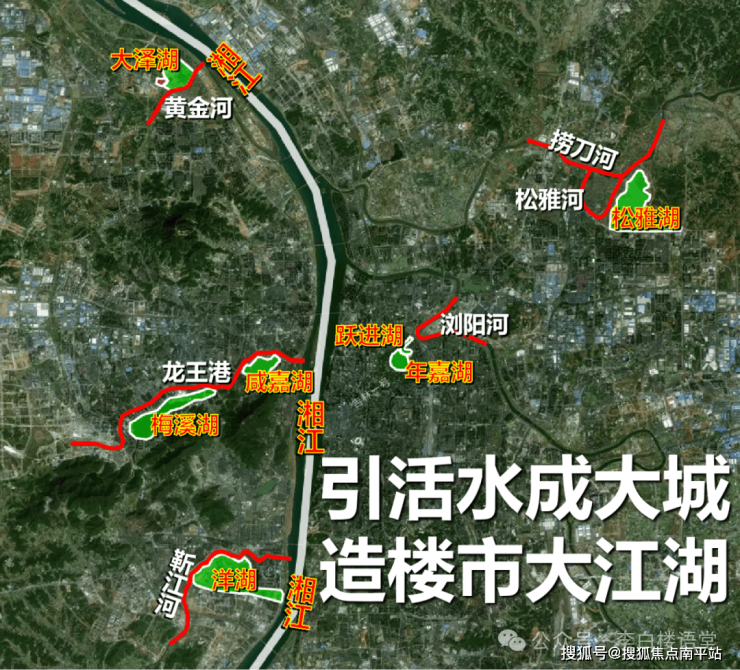 在长沙,河流入江,湘江北上,江河奔流所汇之地,往往有大面积水域——湖。活水奔流,蓄积于湖,这样的湖,是福气之地、财运之地,也是长沙豪宅密集之地。举目长沙,活水成城,楼市“江/河/湖”之地,一图示之: