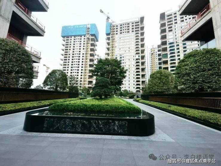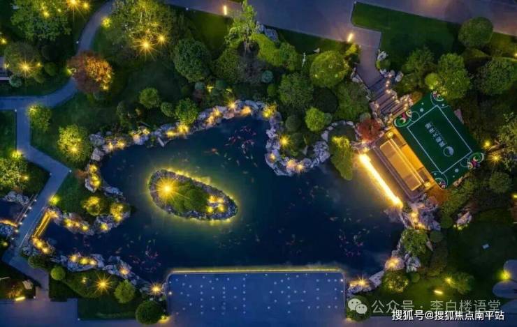 再往里走,是整个楼盘最核心的园林区,约800㎡湖湘梦幻锦鲤池,不规则形状下,更有格调。下图为实景园林俯瞰视角: