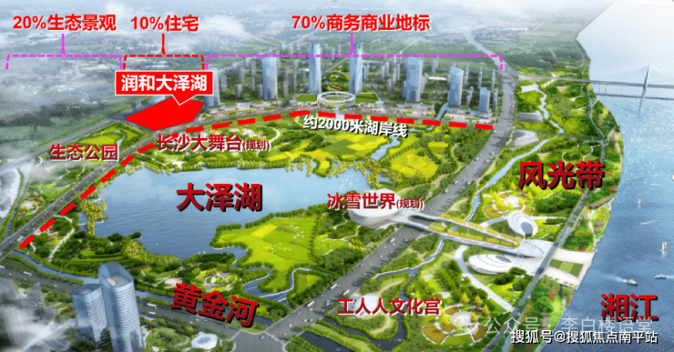 润和大泽湖,是长沙目前唯一一个“临湖+空中花园”结合的高端大宅。楼盘占据大泽湖板块最好的位置,临河、瞰湖、观江、望岛,下楼就是大型文体场馆长沙大舞台(1.8万座,湖南最大室内体育馆,正在规划中),旁边是黄金河生态公园,拥有大泽湖最好的景观视野。大泽湖北岸+西岸近2000米一线头排,70%为商务商业地标建筑、20%为公园景观,仅有的10%给予住宅,被润和大泽湖一盘独占,绝版。