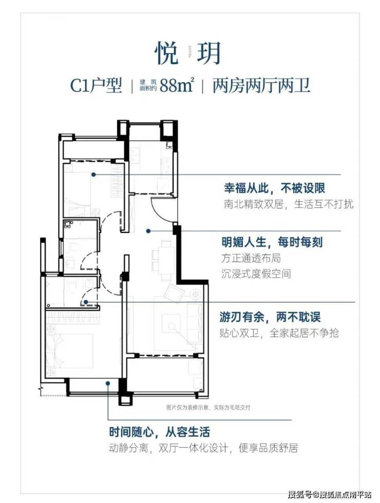 •主力户型有59-61平的一房,80-88平的两房两厅两卫,以及122-131平的三房三卫,户型多为南北通透、动静分离设计;