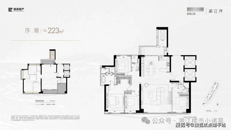 建筑面积约223㎡户型,辽阔总面宽、南向四开间、三面采光、主卧度假级套房、LDKB一体化设计等,雅契栋梁品位。