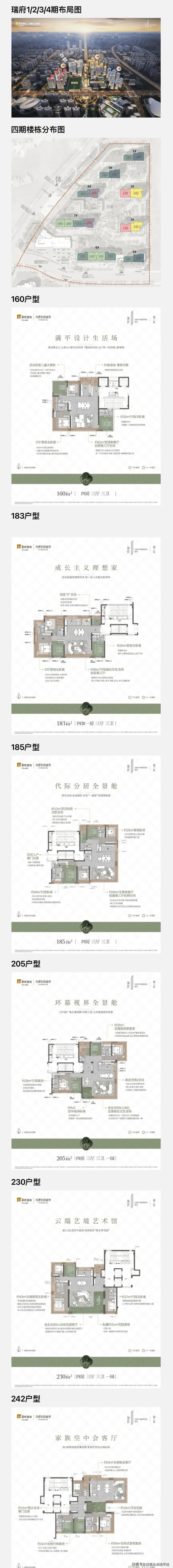 共有6个户型,分别为: 建面约160-183-185-205-230-242㎡。