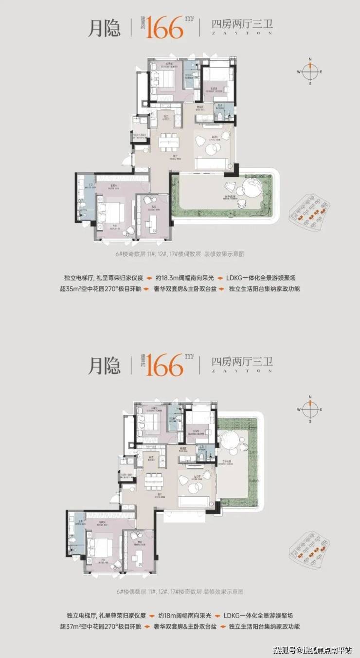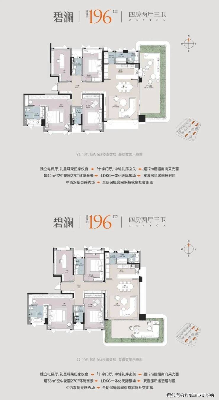 独立电梯厅带来归家的私密尊崇 ,十字门厅高效串联全屋空间。 超17米南向巨幅采光面让阳光点亮全屋空间, LDKG一体化大方厅与 空中花园相连,极致放大空间感, 开启270°环幕观景视角。 星级南向双套卧保障主人与长辈的舒适起居,另配备 全明保姆间更契合高阶家庭生活需求。