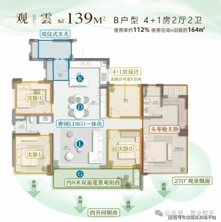 而 139㎡B 户型更是 "惊艳款":5 房设计搭配百变 X 空间,既可以改造成书房、瑜伽室,也能作为儿童游乐区,满足家庭不同阶段的需求;112%的使用率让它拥有旧规164㎡大平层的体验, LDKG一体化设计(客厅、餐厅、厨房、阳台连通)让公共空间更通透,中西双厨布局则适配年轻人的烹饪习惯;