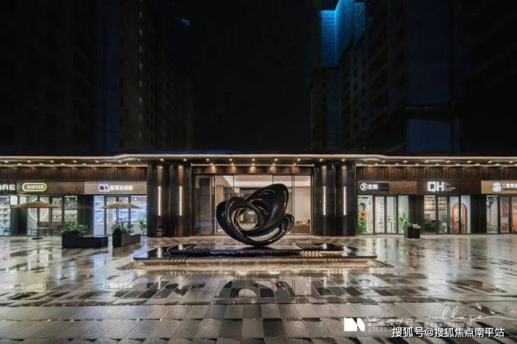 2.品质社区大门:主入口作为社区与城市接驳以及业主归家第一空间,承载了进出与识别、保护与阻隔的重要功能。璀璨学府东入口门楼整体面宽约 45 米(含商业立面),最高位建筑高度约 5.5 米。两翼舒展,同湘府英才益清小学对望,取意鸿翔鸾起,隐喻奋发有为
