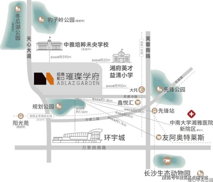 天心的整体建设,沿着天心大道(自天心中心-新开铺板块-黑石铺板块-解放垸板块)高速向南发展。而璀璨学府项目地处天心向南的关键枢纽处,北邻省府、西邻黑石铺及解放垸、南临中信商圈、东临红星,距离奥体中心(规划中)直线距离仅约3公里,享受成熟板块配套利好以及规划板块的未来红利