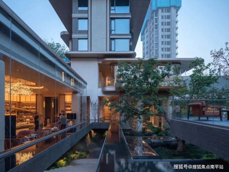 庭院,一方闹市中宁静的绿洲。走进这片园林,城市的喧嚣被隔离在外,树影青葱,镜面水景层叠错落,如同玲珑的百宝盒,洒落在山涧中。多层景观台地弱化场地高差,形成层次丰富的立体景观;四面悬浮感玻璃盒子环绕,模糊室内外边界,山水之色与精奢生活在其中无缝衔接。