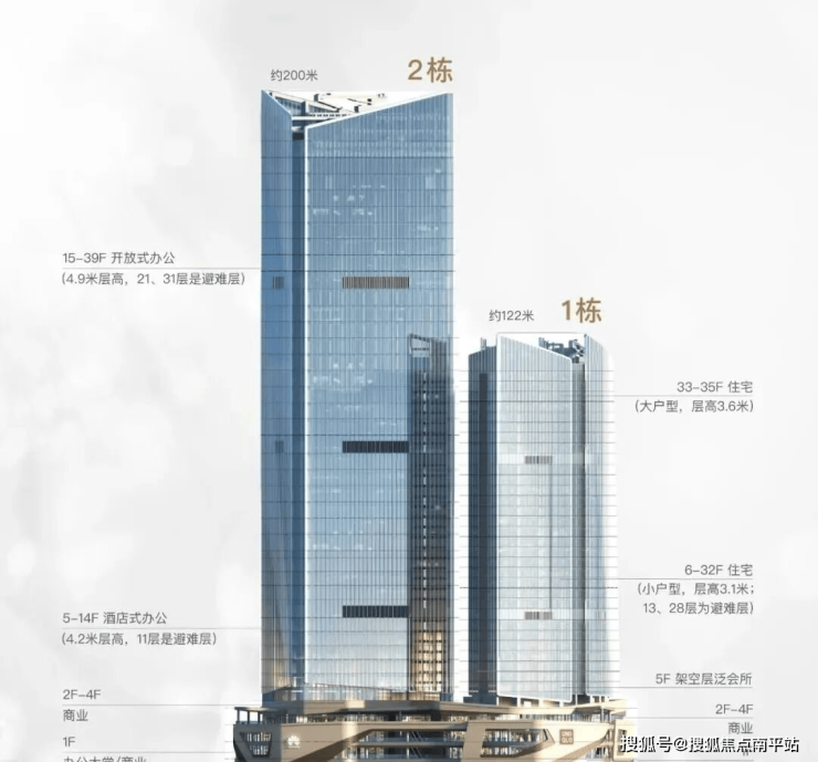 项目产品:楼高 122 米,共 35 层:裙楼商业( 1-4 层);架空层泛会所(5 层)