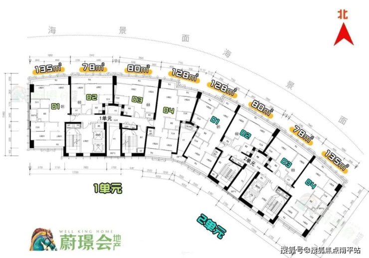 上图为从左至右的户型排列,左侧为1单元,右侧为2单元,同在一栋楼体,分别入户,两梯四户,以下按照从左至右顺序介绍各个户型图及景观,33-35层大户型在最后展示。