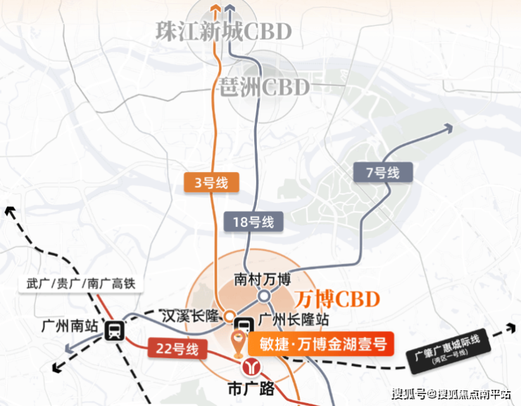 出门约1公里达22号线地铁市广路站,1站番禺广场、2站万博中心、3站琶洲CBD、4站珠江新城;规划中26号线。