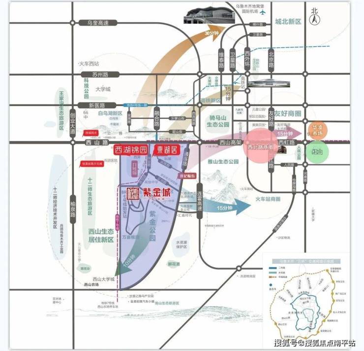 以紫金城为轴心,5分钟接驳乌奎高速;10分钟走至乌市主城区、华凌商圈、友好商圈、西山大学城;15分钟至火车站商圈、西北路商圈、经开万达、德汇万达、白鸟湖片区;30分钟至地窝堡机场,圈定“30分钟繁华生活圈”。目前,西山路、通连路均已通车。门口5条公交线路,(3201路、2007路、2004路、518区间、22路),周边还有Brt7,周末游玩、日常通勤,出行方式日渐丰富,是置业购房的不二之选。