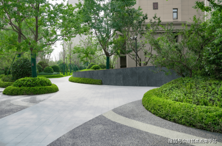 北区的景观也是精致感满满,灰色沙砾图案融入硬化路面,彰显年轻活力的园区氛围,螺旋式的景观围墙,更增添了一抹艺术色彩。