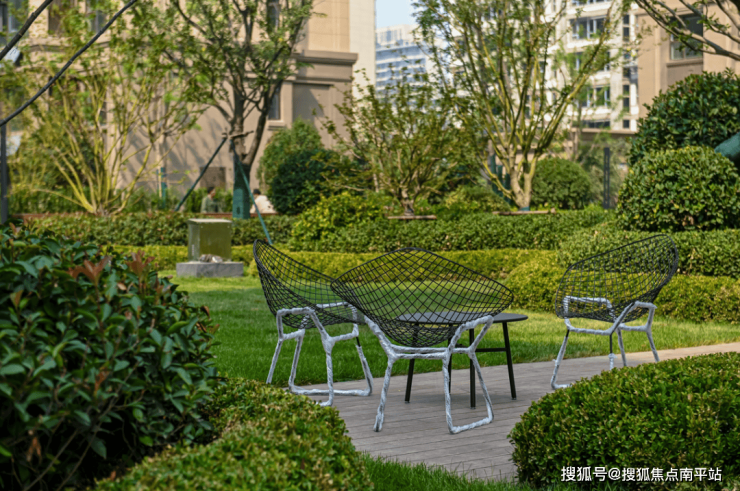 多个景观组团串联,植物种类不胜其数,绿意满布整个园区,树荫下,灌木繁密簇拥,草坪柔软如地毯,景观小品点缀,倍显韵律感和层次美。