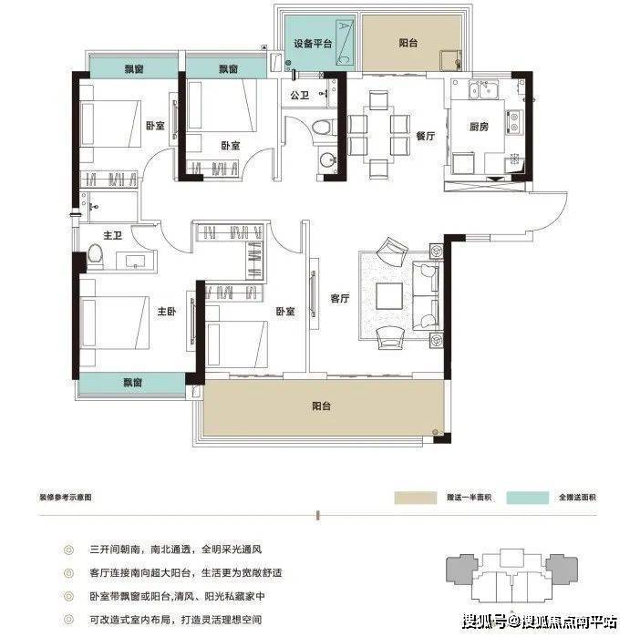 建面约139平四房两厅,南北通透: