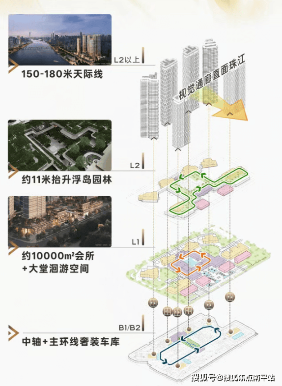 B1和B2是业主的归家环线,包括星空顶的奢装车库以及中轴,通过酒店式环岛落客,给足排面。