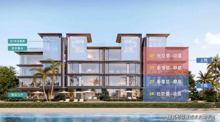 上叠,除独门独院和地下室之外,还专享超大瞰海天台,客厅挑高达到创纪录的7米,并采用了造价高昂的“全面屏玻璃”外立面。