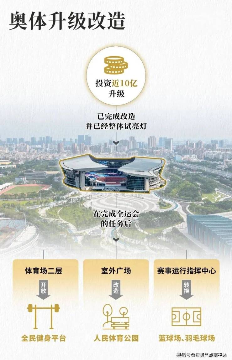 10亿升级的广东奥体中心,已完成改造,并已经整体试亮灯。在完成全运会的任务后,其体育场二层会开放为全民健身平台,室外广场会改造为人民的体育公园,赛事运行指挥中心将动态转换为篮球场、羽毛球场等。