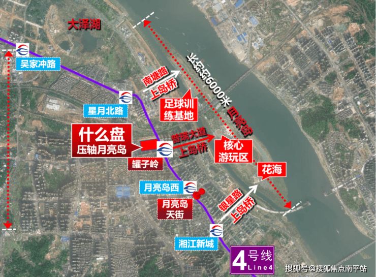 重点来了,5000米月亮岛对应的岸边,你会发现刚好对应长沙地铁4号线的5个站点。岛之头对应前两个站点、岛之尾对应后两个站点,核心腰部位置对应中间地铁站——罐子岭站: