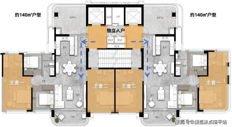 140㎡户型:2梯2户专梯入户的纯板楼设计,双主套三卫保证每位家庭成员的居住舒适度,长辈房朝南还近门口,两代人住一起互不打扰,各自拥有绝佳私密性。