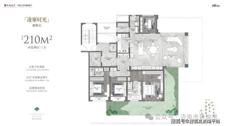 3#、6#、9#、13#为小高层,210平,2.8-3.6万,590-760万,得房率在109%到112%。四室两厅三卫,果然面积越大户型越好,四面宽,大宽厅,客厅三面采光,三面都是大窗户。啥毛病都没有,就是有点贵,预算干到这个价格可能有人说干啥不买贤文跟科技城呢,只能说就看你是要产品还是要位置了。