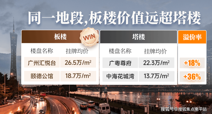 不仅如此,板楼还具有更强的溢价能力和流通性。以珠江新城为例, 在同一地段下,板楼要比塔楼售价提高18%-36%,且在市场上 流通性更好、成交周期更短。
