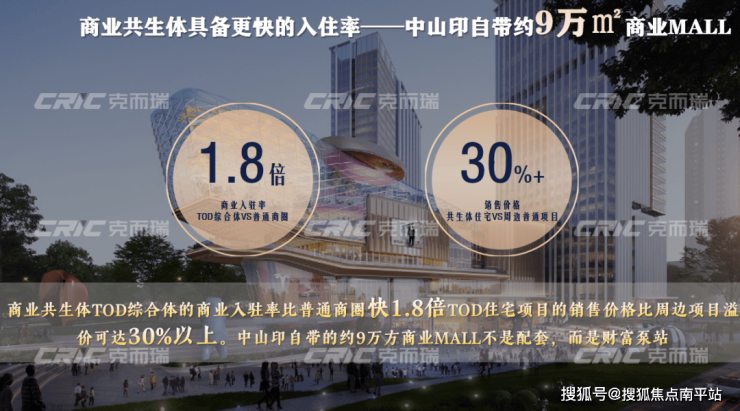 研究显示,TOD综合体的商业入驻率比普通商圈快1.8倍,TOD住宅项目的销售价格比周边项目溢价可达30%以上,而信达金地中山印自带的约9万㎡自持商业MALL,将成为项目住宅价值提升的重要 “财富泵站”。