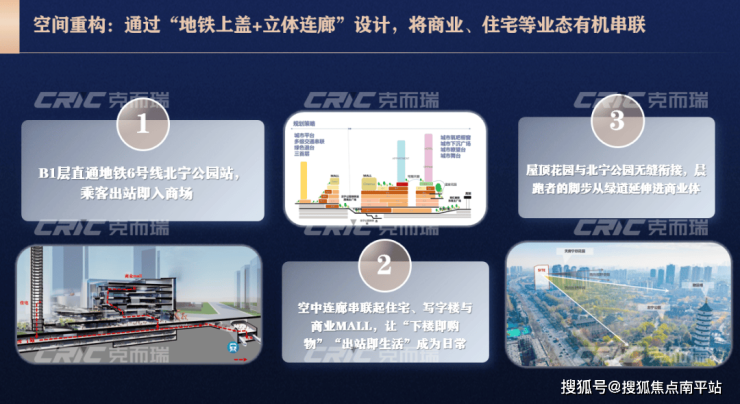 空间重构。项目为地铁 6 号线北宁公园站上盖,B1 层直通地铁站,乘客出站即入商场,交通便利性极高。同时,空中连廊串联起住宅、写字楼与商业 MALL,屋顶花园与北宁公园无缝衔接,实现了商业、居住、生态的有机融合。