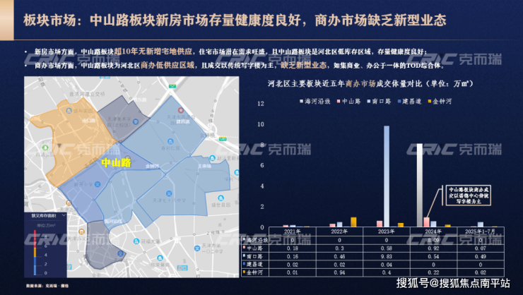 而在商办市场,中山路板块为河北区商办低供应区域,成交以传统写字楼为主,缺乏如集商业、办公于一体的 TOD 综合体这类新型业态,市场供给与需求存在明显错配。
