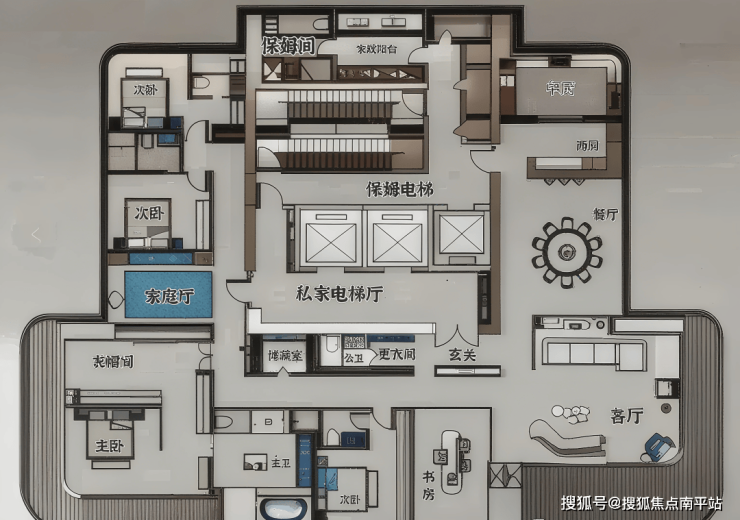 - 510㎡一层一户顶豪:3梯1户的专属配置,层高3.6米,5+1房3厅5卫的阔绰格局,搭配165.77米的地标高度(43层),将"私密性"与"仪式感"拉至顶点。这种"一户独占整层"的设计,不仅是空间的奢侈,更是圈层纯粹性的象征。