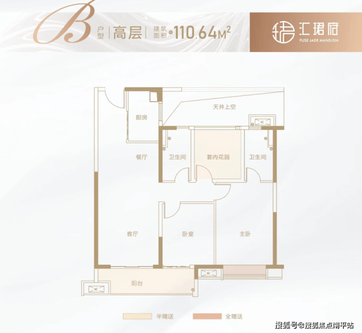 约5.6米南向双连景观阳台+北向套内花园,只计算一半建筑面积;主卧飘窗不计入建筑面积。