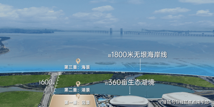 泉州发展·观澜云境一线紧邻约360亩生态湖境及超1800米滨海公园无垠海岸线,项目约600米范围内,覆盖园-湖-海三重景观资源,在繁华之中,贵隐静谧水岸。
