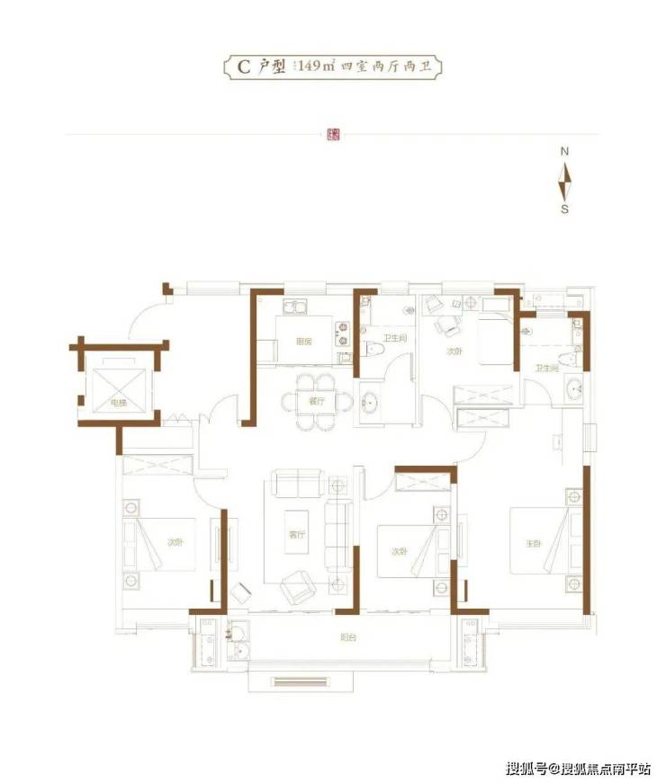 1#楼为11层毛坯洋房,一梯两户,公摊21.6%,户型面积为149平四室。
