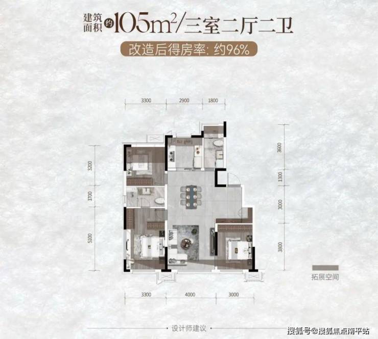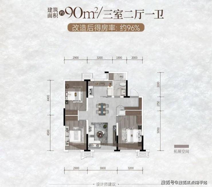 高得房率极大提升了户型的功能性,建面约90㎡户型中,实现了“三叶草”的布局,LDK一体化方厅增强空间通透性。