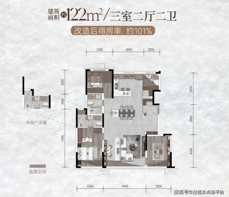 以122㎡户型为例,实际使用面积超122㎡,实现“零公摊”,5.4米宽厅搭配情景岛台,主卧套房融入独立衣帽间与卫浴,一举改写高层得房率低于洋房的历史。