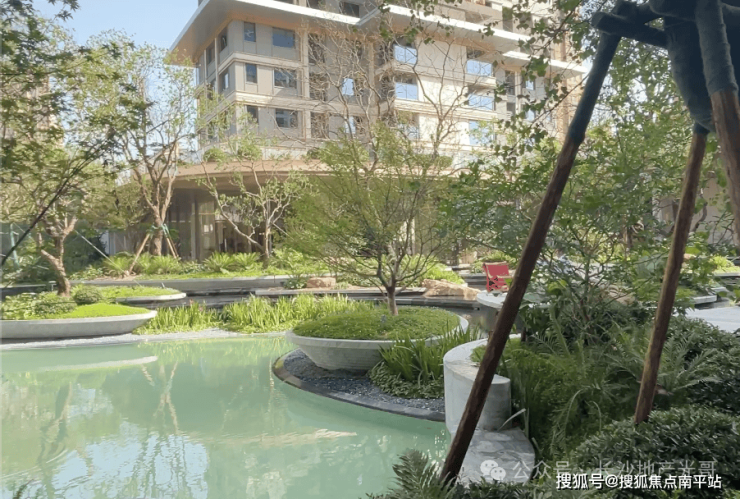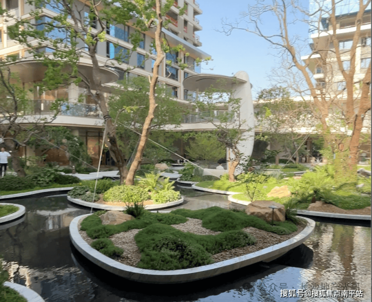 小区规划浮岛式下沉庭院 + 水景园林,还有健身区、儿童游乐区