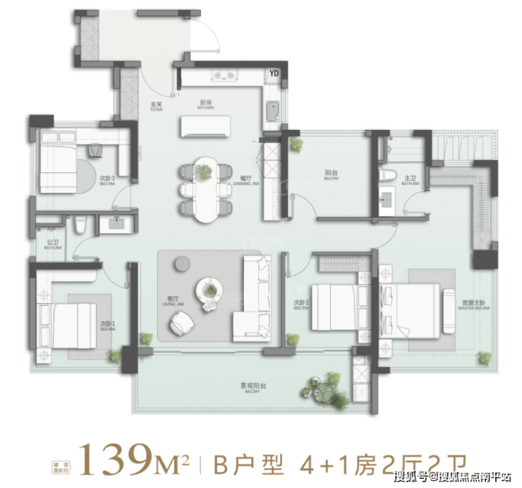 139㎡B户型则创新性地实现4+1房设计,北侧阳台被巧妙预留为X空间,可根据需求打造成书房、健身房等多功能空间,使用灵活性大幅提升。