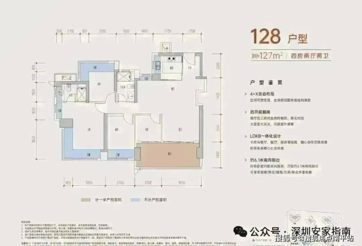 126-128㎡的4房2厅2卫,设计的是经典竖厅格局,进门入户玄关,客厅3.65米开间,LDKB一体化,S墙设计预留冰箱卡槽位,四开间朝南,动静分区,主卧+1个次卧270度大飘窗,客厅连接次卧出6.15米长大阳台,分别做到了主卧20.14㎡/次卧11.28㎡/次卧10.58㎡/次卧6.37㎡(包含墙体飘窗),U型厨房,卫生间干湿分离,得房率约:77.3-77.39%(不含赠送),东南朝向。赠送面积21.54㎡,加上赠送得房率94.45%。